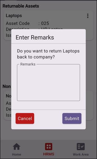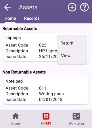 2. You can initiate a request to return an asset allocated to you. Tap on the right action buttons and tap on Return