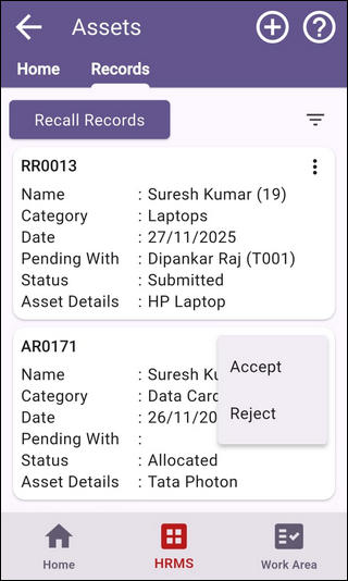 Swipe right on Assets > Home page to see Assets > Records page.