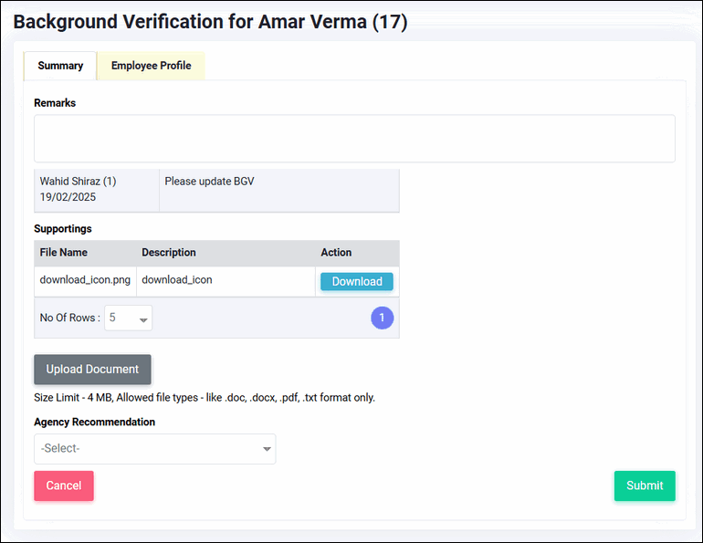 - Background Check Unverified: use this if the background check has not been completed, you can record the reasons in remarks or the uploaded report