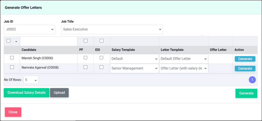 2. Select the Job ID and Job Title. Candidates interviewed for the selected Job ID will be shown. You can either select all the candidates or select the ones for whom you want to generate the offer letter.