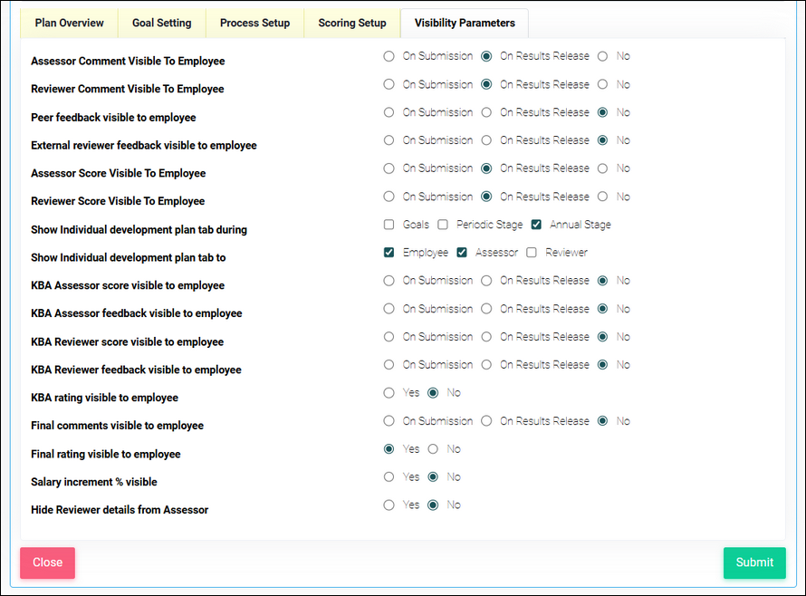 - KBA Assessor score visible to employee / KBA Assessor feedback visible to employee / KBA Reviewer score visible to employee / KBA Reviewer feedback visible to employee : these four parameters control the visibility of Key Behavior Assessment inputs to employees