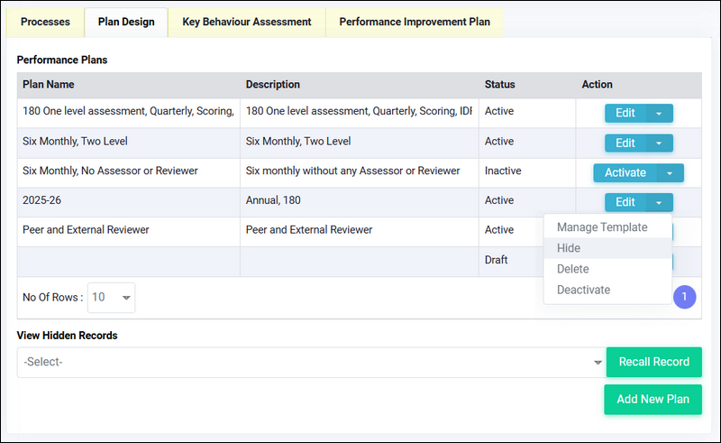 - Use "Hide" button to hide a plan, once a plan is hidden it cannot be used in