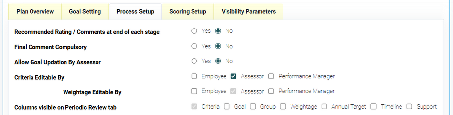 - Columns visible on periodic review tabs : Group / Criteria / Weightage / Goal