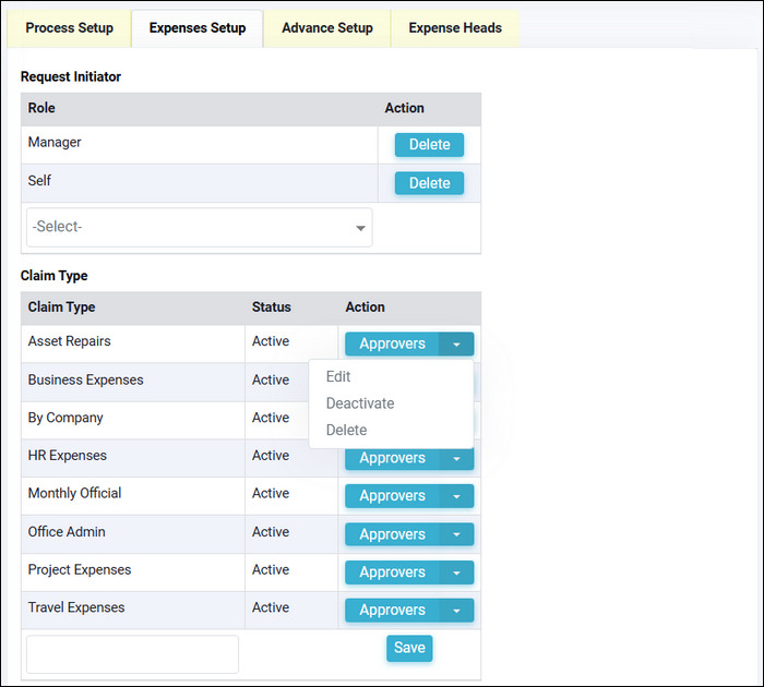 2. Claim Type - If you activate "Enable Multiple Claim Types" in Process Setup, then you can create multiple types of claims, the advantage of using this feature is that for each claim type you can have a different approval workflow. If you do not activate this option, then only one approval workflow can be designed. Once this feature is activated it cannot be deactivated.