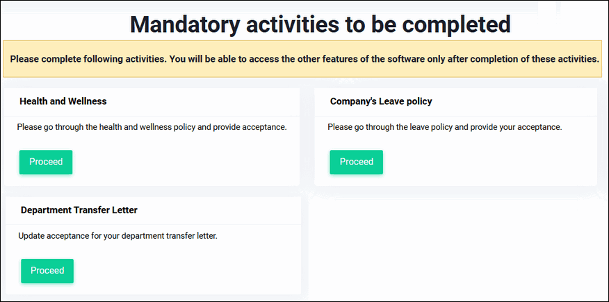 You can select the policies or system documents which you want the employees to acknowledge / accept / e sign before they can proceed to do any other activity on the software. These activities are visible on the dashboard as shown below.