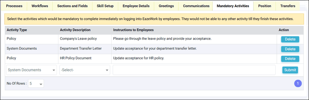 Enable Mandatory Activities on Login - using this feature you can define some mandatory activities which need to be completed by the employee when they login to EazeWork HRMS on the browser or on the mobile app. When this parameter is enabled a tab to configure mandatory activities is made available. Refer to Section 5 below for more details