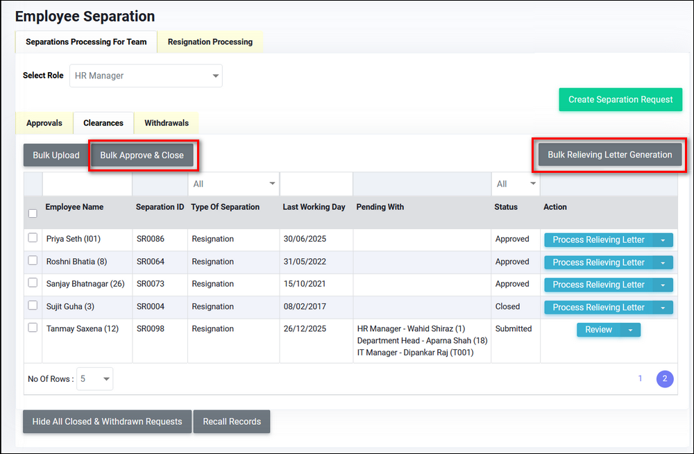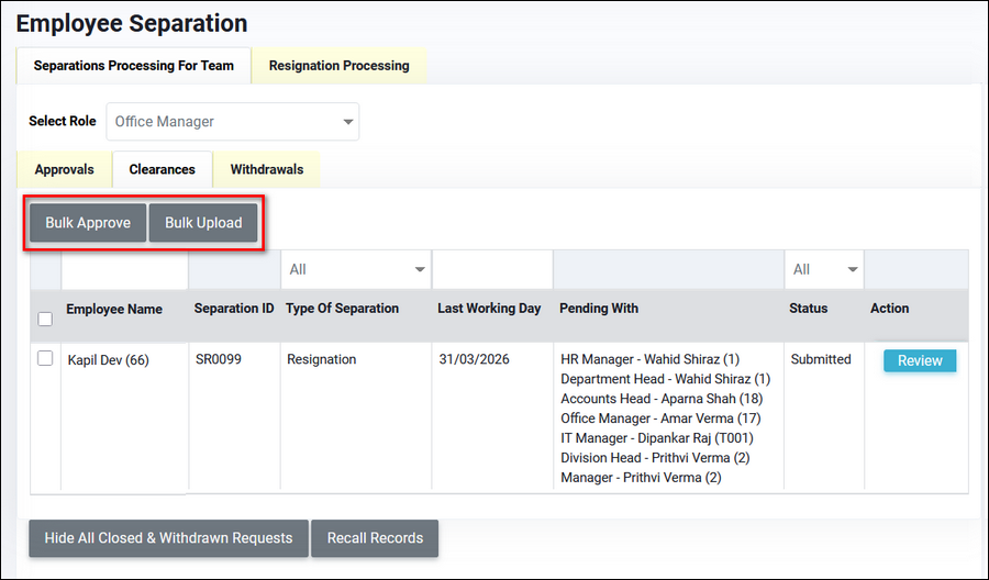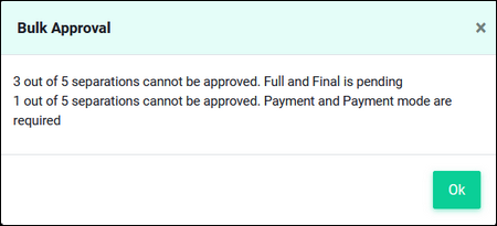 3. Click on the "Bulk Approve" button. Even if Remarks are made mandatory in setup if this option is used separation records will be approved. If assets are allocated to employees or if payroll is not activated and hence payment details are needed from Accounts Head then bulk clearance approval cannot be given. Even if records which need these inputs are selected they will not be approved.
