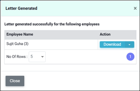 the "Bulk Relieving Letter Generation" button. You will get a popup from where you can download the relieving letters. These letters will also be emailed to the employees on generation. If Relieving Letter is already generated for an employee it will not be regenerated.