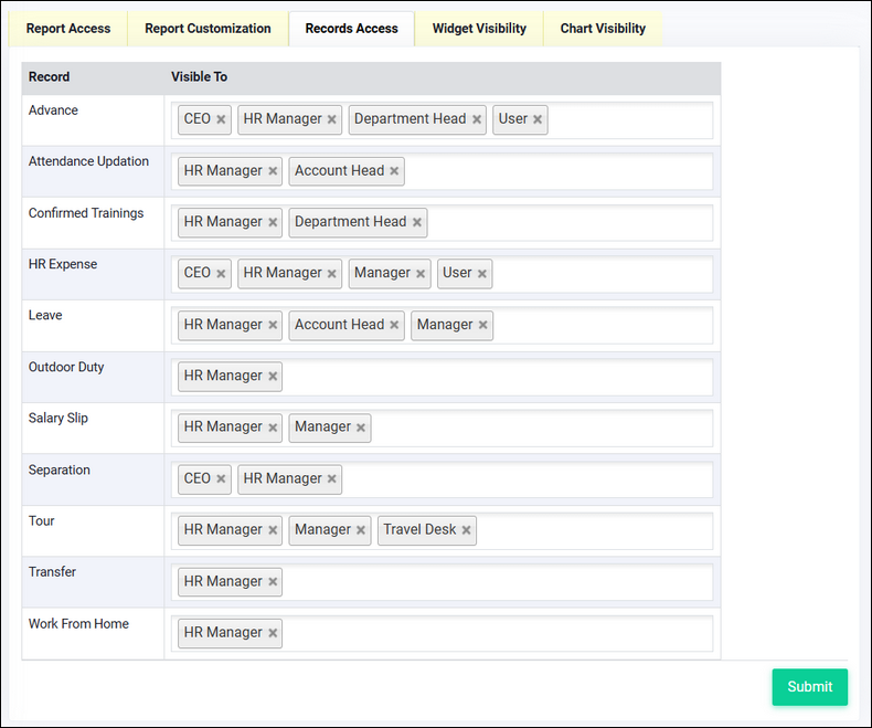 Menu Path: Setup > Common > Access Control and Report Design Accessible to: Application Administrator 1. Widget Visibility Widgets which can be made available to the employees and can be added or removed by them on the dashboard. Some widgets are ...