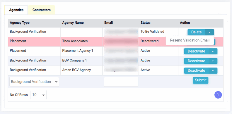 A validation email will be sent. On validation the status will change to Active. The license cost for agency will be billed from the month it is activated. If you do not want to continue using the agency you can Deactivate it. On deactivation the license will be released. If the agency has not been validated you can delete the record.