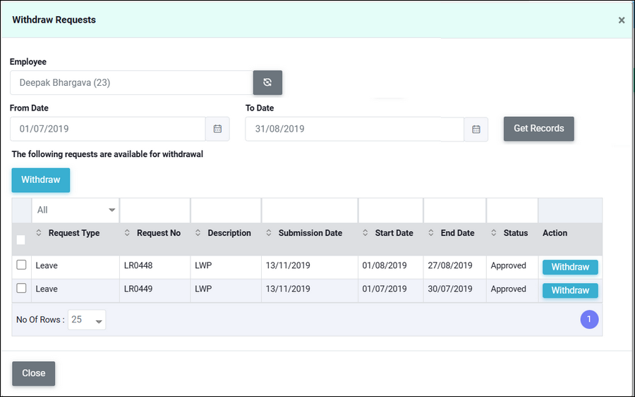 will show Attendance Updation, Leave, Outdoor Duty, Tour, Work From Home requests. These withdrawal requests will not