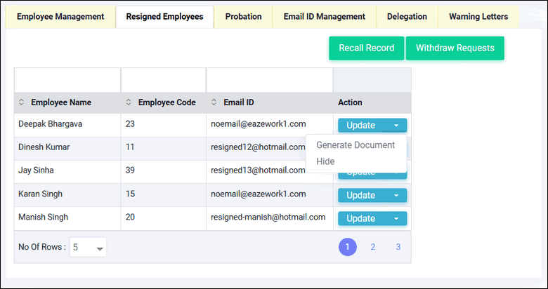 Menu Path : HR Manager > Employee Management > Resigned Employees tab