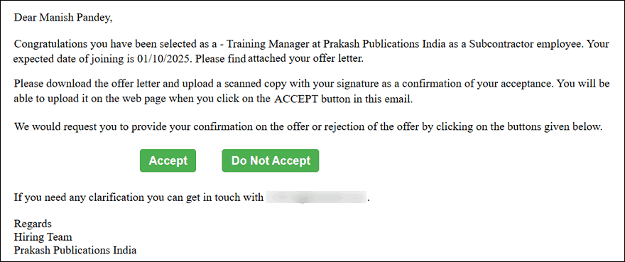 Candidate can accept or reject his offer on email using "Accept" or "Do Not Accept"