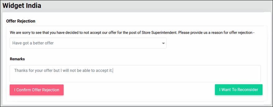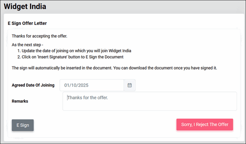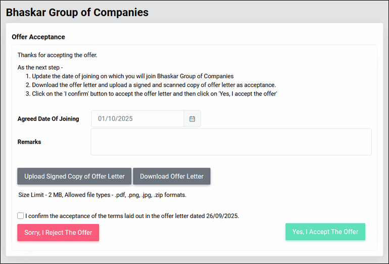 On acceptance by the candidate, Offer acceptance page is opened in which he can