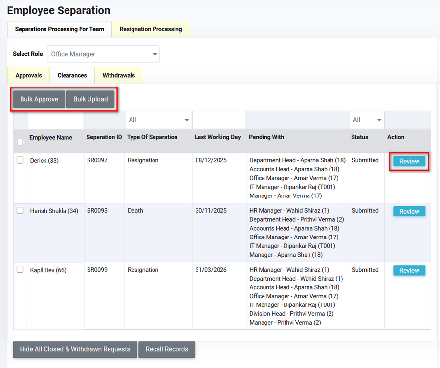 5. After providing your inputs click on "Submit" to approve the Clearance request. When you submit the record an alert will go to the HR Manager.