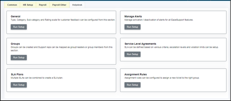 Only Application Administrator has access to Setup. The setup section is broken up into five sub sections.