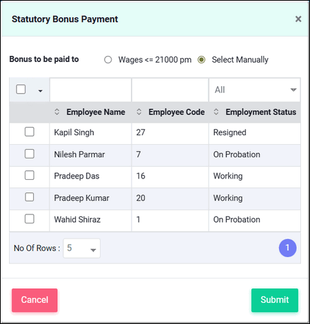 When you select the second option you will see the table as shown below from where you can select the list of employees to which bonus will be paid.