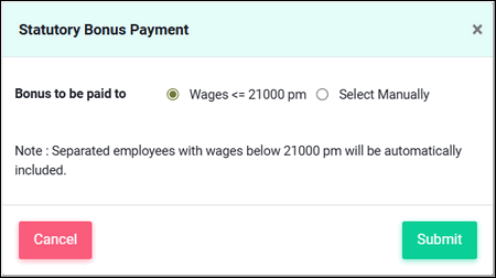 1. Select the option to process Statutory Bonus as shown above in the Payroll process - Step 2 stage.