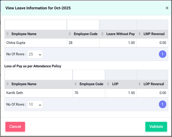 If Attendance Policy based deduction feature is activated and if there are LOP being deducted due to late coming or short working you would be able to review and validated them too.