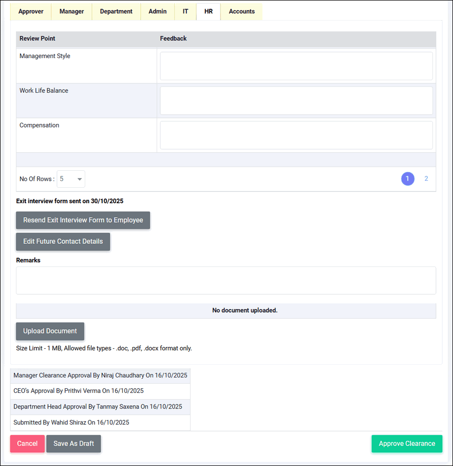 HR Manager can be processed for clearance by clicking on "Review" button. Tab as shown below will be shown. You can update the review points, capture remarks, upload documents