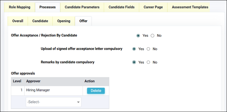 - Upload of signed offer letter compulsory : if this parameter is selected as Yes then if the previous parameter is also Yes then the candidate will have to upload a file while accepting the offer through email. Independent of the previous parameter the Recruiter will have to upload the scanned copy of offer letter as acceptance of offer if candidate has not done it. This parameter will not be visible if E Sign feature is enabled