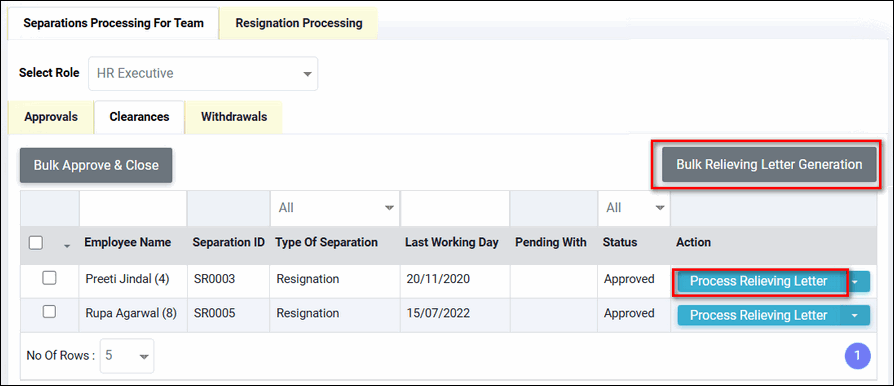 You can also click on “Process Relieving Letter” button on the row.