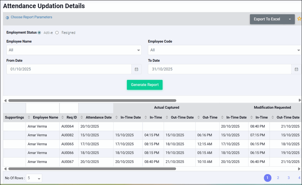 Menu : Reports > Attendance Report shows submitted / approved Backdated Attendance requests. This report can be generated for all requests together but can be generated for maximum period of one month at a time. The From Date / To Date is linked to ...
