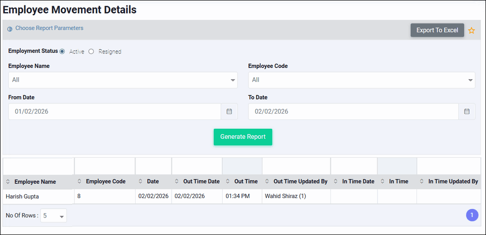 Details of the In and Out times marked by Security team under the Employee Movement feature are shown in this report.