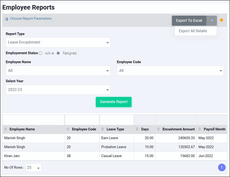 Use "Export All Details" option to get details of leaves encashed, amount received and leaves set off against notice period for separated employees. Refer to the report on Leave Encashment to see details of leave encashment requests submitted through Leave module.