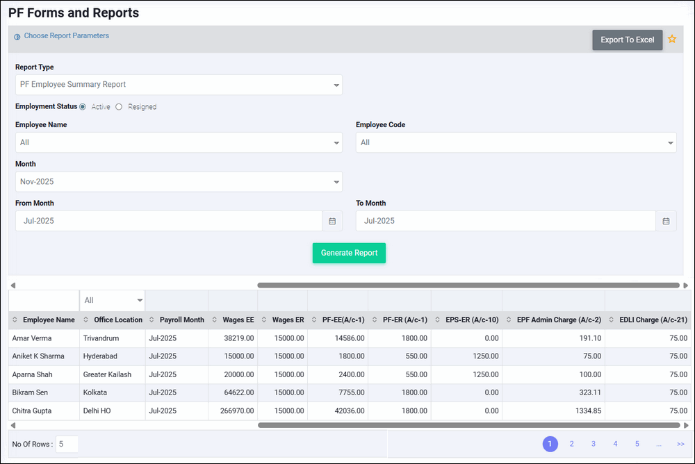 Reports > Payroll > PF Forms and Reports From this report you can get the monthly aggregate values of amount paid in various heads of PF deduction by Employees and Employers. Select the month and click on "Generate Report". Click on "Export to Excel" ...