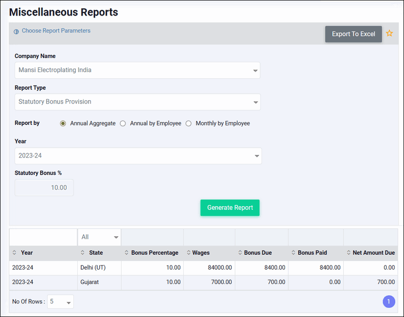 Reports > Payroll > Miscellaneous Reports Through this report you can get details of Statutory Bonus paid. The report can be viewed for all employees for one financial year or for one employee for any period. In the Wages column the wages which are ...
