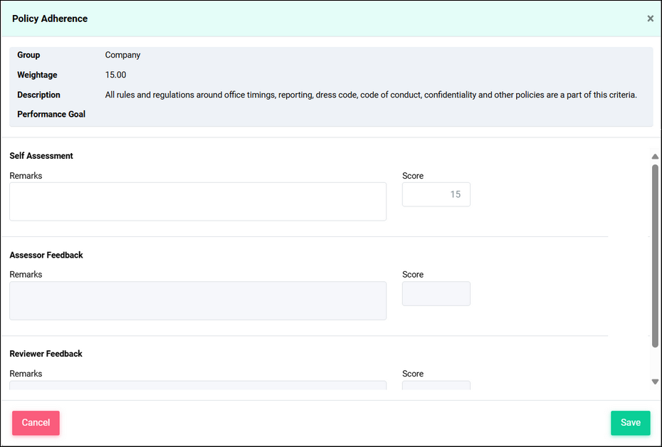 Based on the company's policy there might be some periodic assessments, this can be quarterly, six-monthly or annual activity. An alert will come when the window is opened for this self assessment and the activity can be completed from the same section from where the goal setting was done.