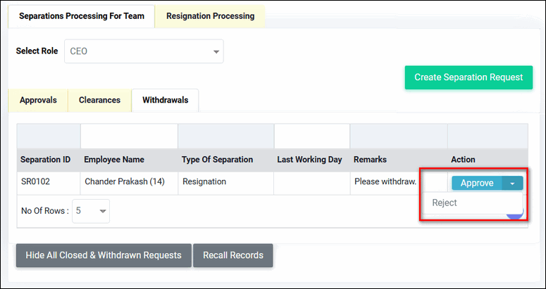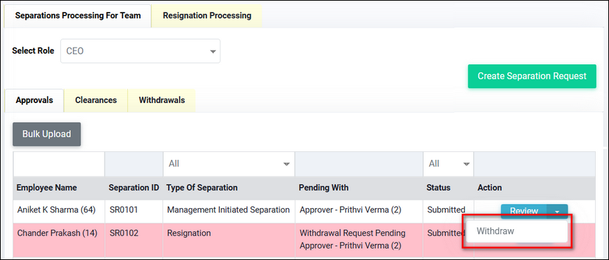 2. Approver can withdraw a separation when it is Submitted or Approved status without submission of a withdrawal request by the Employee