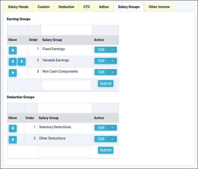 In this tab you can create groups which can be an Earning group or a Deduction group. Once the groups are created here you can map them to the heads in the earlier tabs. You can set the order of groups and when salary details are shown in a letter they will be shown sorted by the order set here and within a group the heads will be sorted alphabetically.