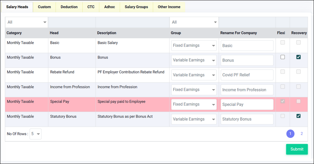 Flexible benefit heads you can select the checkbox in the "Flexi" column. If you want to recover the