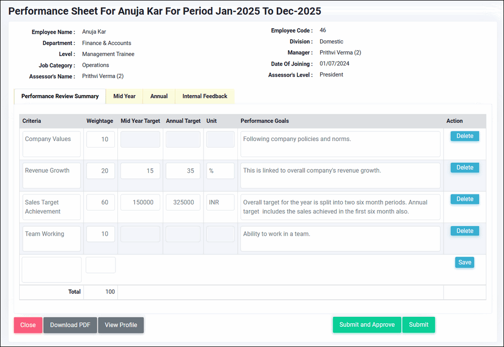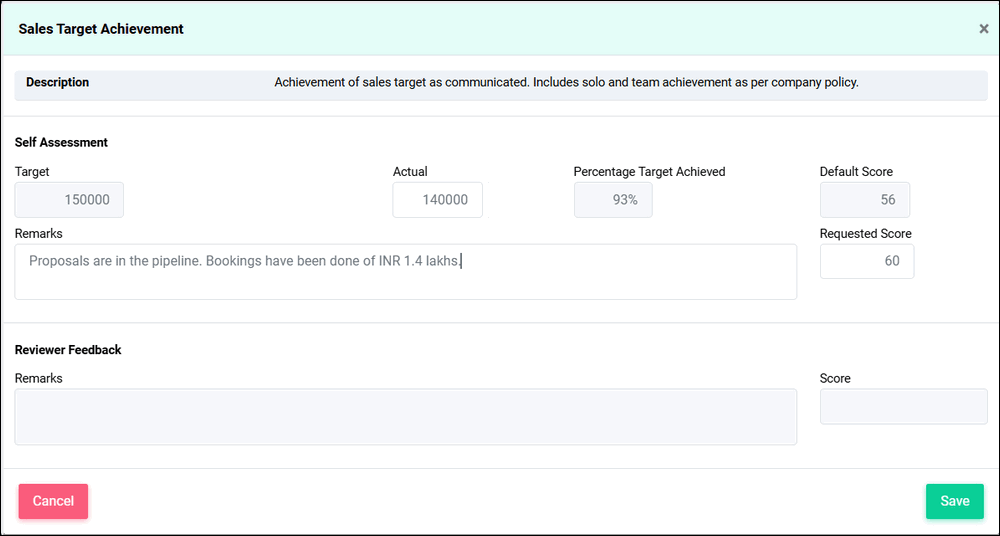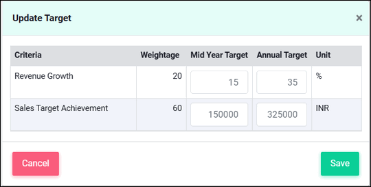 During the goal setting process employee needs to fill up the target, six monthly in the example shown below. Assessor can modify the target, the option to change the weightage or criteria is available only if enabled in the setup.