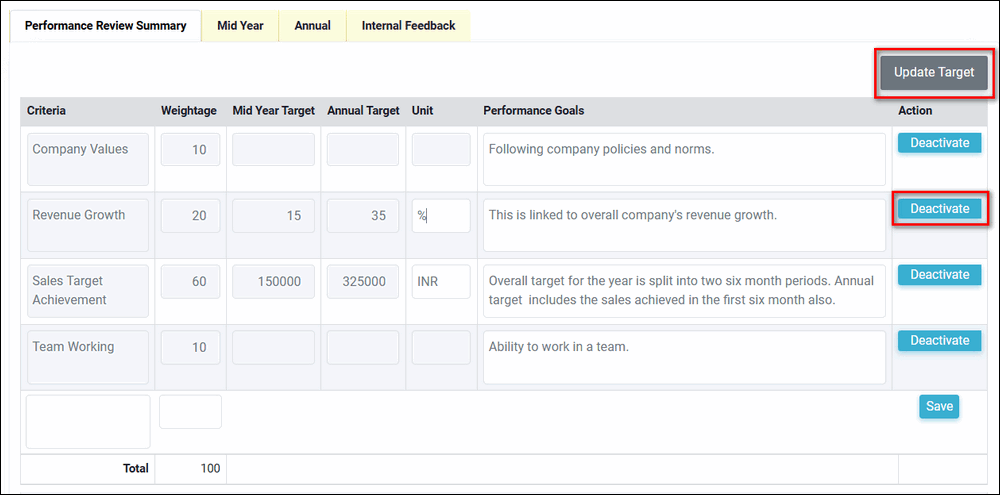 Refer to Creating Performance Plans to understand how to create a performance plan with the Target based review feature.