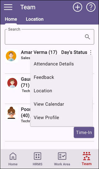 1. Employee summary - key information like photo / name / employee code / designation and day's attendance status are shown on the page. If employee has punched in / out then the in / out times are also shown. Whether only direct reportees are shown or all reportees are shown will depend upon the team definition in your company.