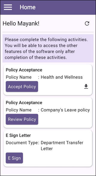 Tap on the button and you will be navigated to the page from where you can complete this activity. You will be able to access other features of software like marking attendance once you have completed the acceptance / acknowledgement of the mandatory activities.
