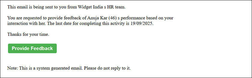 Menu Path : Team Details > Performance Review tab Accessible to : All Employees When you are mapped as a peer and have to provide feedback for a colleague you will get email notification. The activity will also show in your pending task list. Steps ...