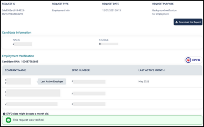 With these details, the request is sent to the network, from the network the request will be sent to the previous employer who will verify and respond to the request. Data received against this request is shown below.